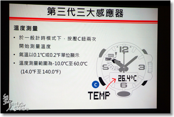 ▲再來是『溫度測量』,在做溫度測量之前題需要說明,是因為手錶是金屬背蓋,會有熱傳導的問題,所以測量溫度建議不要戴在手上時測量;測量則需按下左下的C鈕2次,功能指針會轉到TEMP,這時溫度開始測量,單位可以顯示攝氏或華氏,溫度測量範圍從-10℃到60℃。