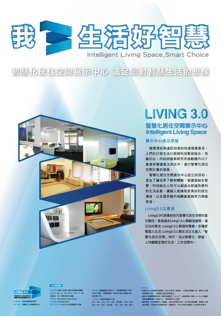 內政部在落實推動「智慧化居住空間」政策,持續進行包含既有建築物智慧化改善工作計畫、智慧化居住空間整合應用展示計畫及相關研究計畫等研究與推廣工作,並整合國內建築空間規劃設計與智慧化產品設備,於98年完成「智慧化居住空間展示中心」;101年完成「智慧住宅單元展示區」建置。鑒於前揭成效卓著,且為擴大推廣智慧綠建築、落實全民化理念及提昇產官學研跨領域交流,於102年結合中南部地區政府及相關產業等資源,打造智慧住宅中南部展示場。配合各展示場所陸續建置完成,遂擬規劃智慧生活研習,並以安全監控、健康照護、便利舒適、永續節能四大主題安排智慧生活課程外,並搭配北中南各展示場所之參觀,提供與會者即時體驗智慧生活的實際應用。