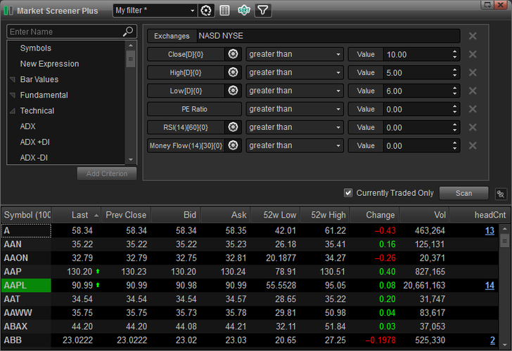 改良的Market Screener Plus+ - eSignal進一步改進了Market Screener Plus,以便提供更客觀的分析。利用新的Market Screener Plus+功能,投資人無需逐一過濾1,000多檔個股,便可立即發現新的交易機會。