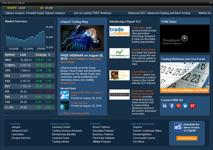 隨時連線 (Stay Connected) – eSignal全新的互動歡迎畫面,可快速提供每個視窗的資訊,強化線上輔助、線上教學影片、事件日曆和動態分享資訊,方便投資人隨時隨地存取感興趣的資訊。