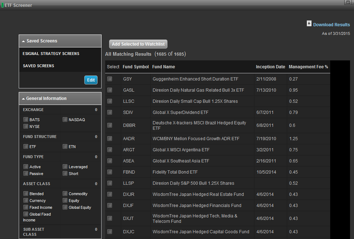 *海選ETF - 該ETF篩選有助於找到交易所買賣基金、ETN產品、信託等商品,內含大範圍的搜索條件如資金結構、資產、子資產類別、貼現的排序和交易量之間其他標準。