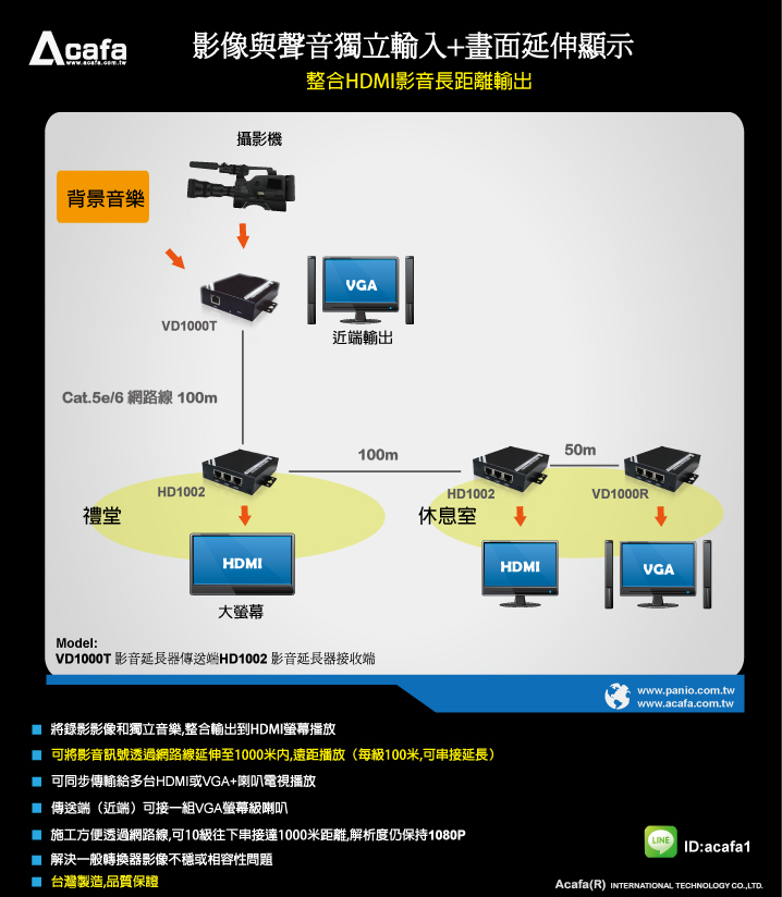 2.可將影音訊號透過網路線延伸至1000米內,遠距播放(每級100米,可串接延長)