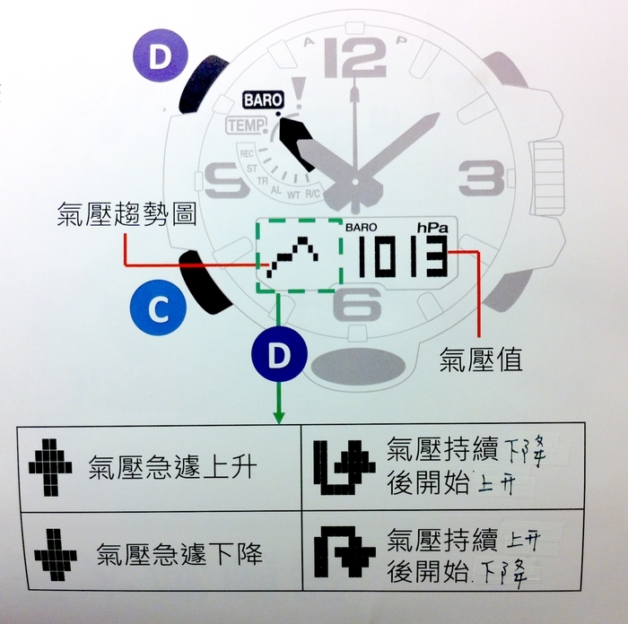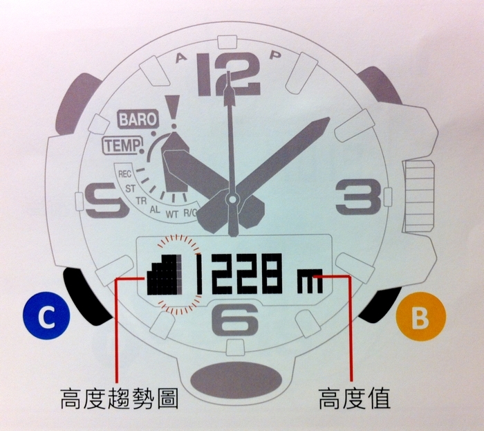 既然量測的功能有四項(方位、高度、氣壓與溫度),為何稱為三大感應器?那是因為高度的量測實際上是藉由量測氣壓值再換算而成。高度測量的範圍為-700 m~10,000 m,精準度達到1 m。此外,量測的結果會與前6次的數據組成高度趨勢圖,以便於使用者像在登山時能參考目前的移動高度。