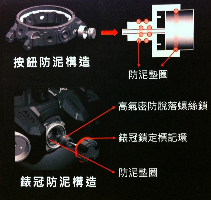 在防泥功能上,GWG-1000在按鈕上使用全新的防泥套筒及防泥墊圈來保護內部的機芯,同時在錶冠部份做了一圈紅色標記環,在調校完成鎖回錶冠時,如果仍看得見紅色環就代表錶冠尚未完全鎖緊。