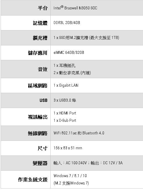 上圖可以明顯的看出幾個重點,除了內建WIFI支援到AC還有藍牙4.0,而我手上這台是內建硬碟空間32G記憶體2G的版本,這樣的迷你主機大概定位就是一般文書機跟影音播放,比較特別的是他有支援螢幕的雙輸出!趕快把他掏出來吧~~