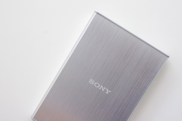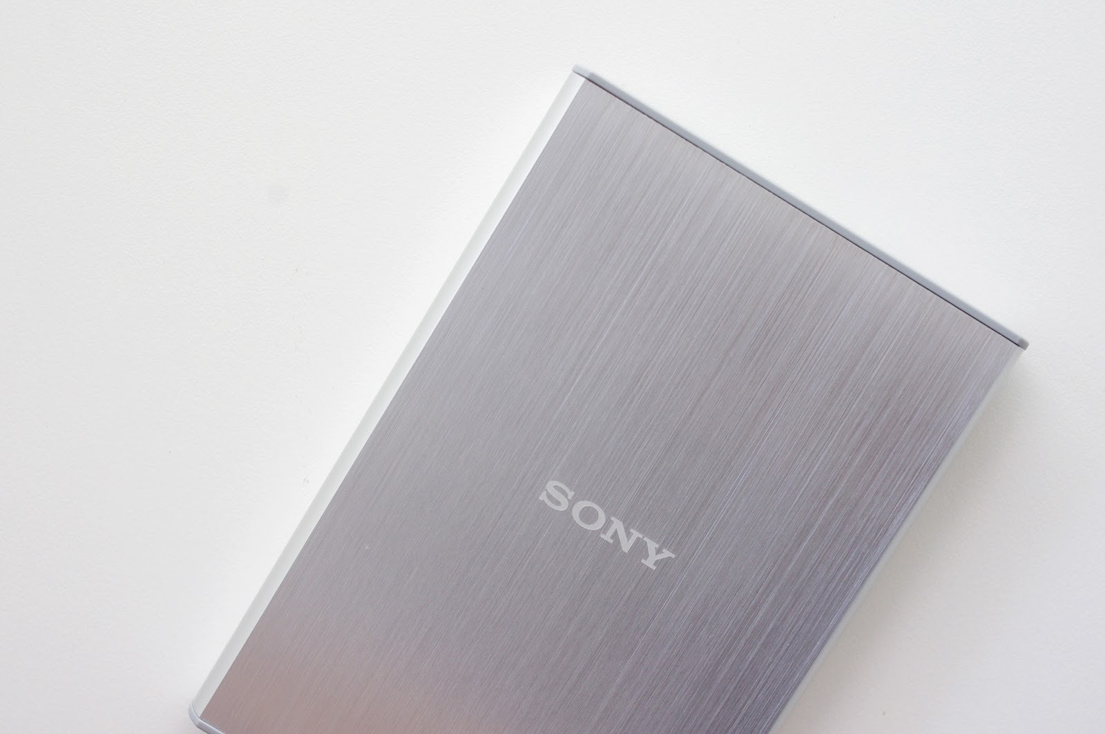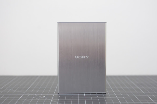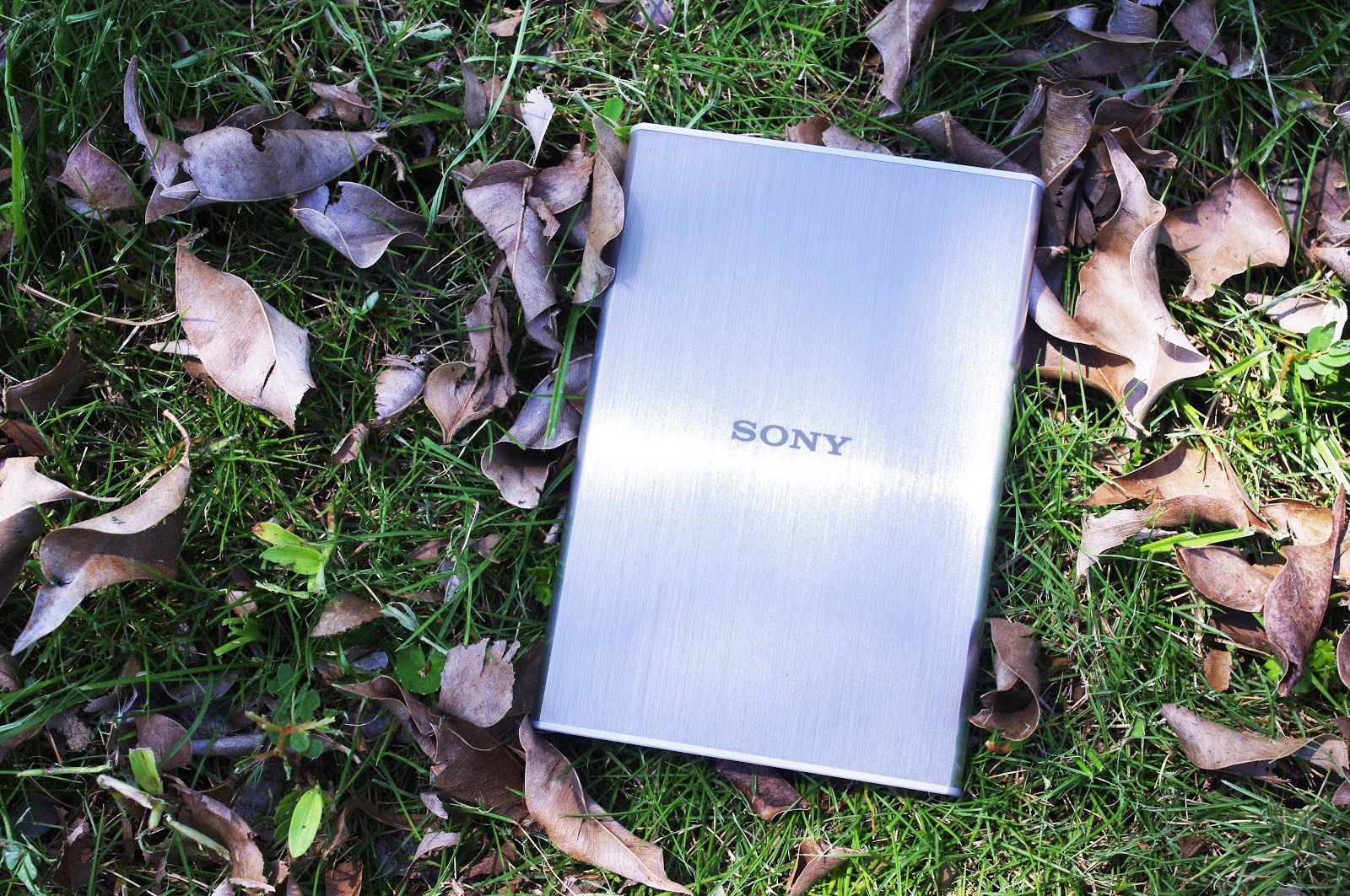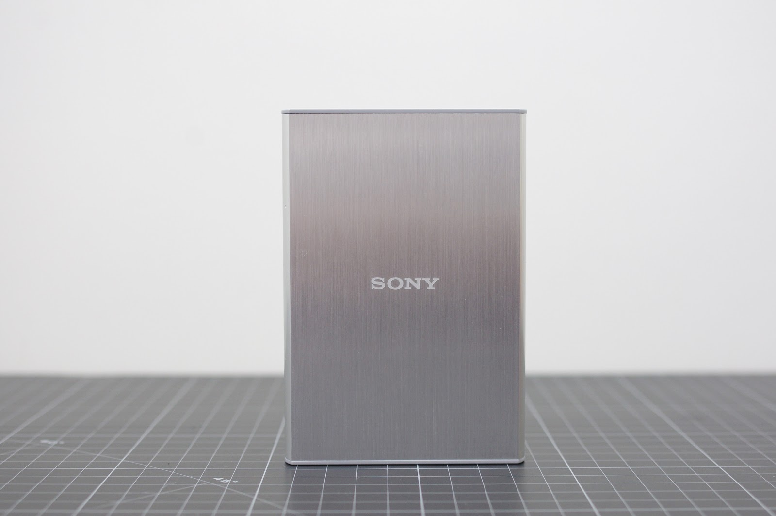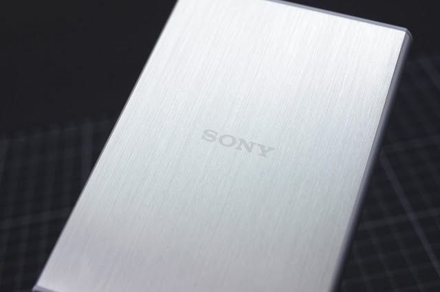 ▼ Sony HD-SL2 行動硬碟的正面,有著金屬髮絲的質感和正中間有 Sony 的 Logo。