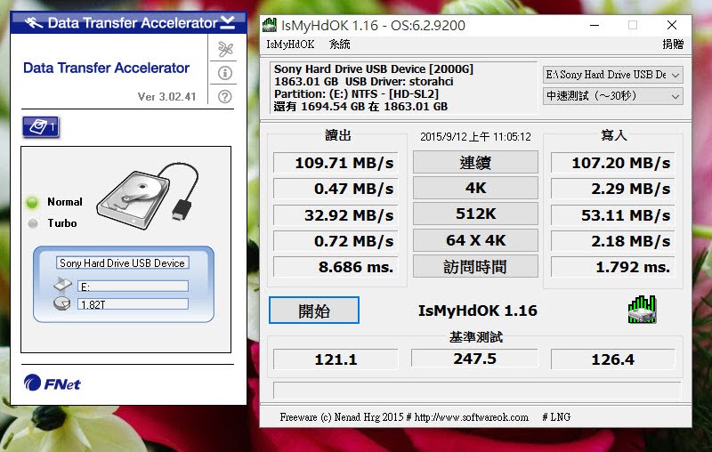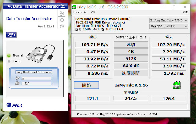 ▼ 利用 IsMyHdOK 軟體來測試 HD-SL2的效能,在沒有開啟 Sony 行動硬碟的專屬硬碟加速軟體(Data Transfer Accelerator)時的效能如下,連續讀寫的效能每秒都有 105 MB/s 以上,這樣的表現讓我滿意。(測試的數字越大越好)