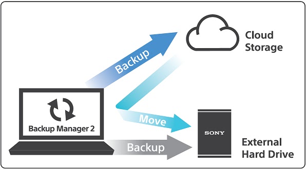 Sony 行動硬碟的 Backup Manager 2 軟體,除了可以備份電腦資料到硬碟外,同時只要你有任何一種雲端空間帳號,像是 Dropbox 或是 Google 雲端空間,也可以將電腦中的資料備份到雲端空間中,但是最神奇的地方,當你接上 Sony HD-SL2行動硬碟到電腦後,這一套軟體還可以把雲端空間的備好的電腦資料再備份到 HD-SL2中,這算是很好玩的設計,上面的圖就是在解釋這件事情。接下來就讓我來實際體驗一下吧。