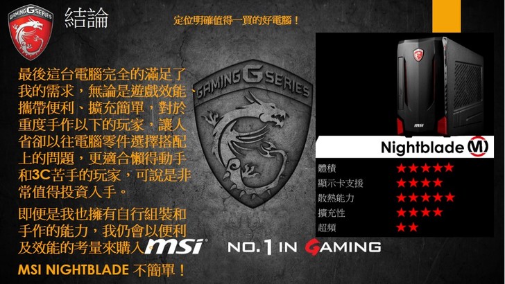 [心得] 微星 NIGHTBLADE MI 迷你PC ★試玩心得★ 更多品牌 · Cosmo Lin · 發表於 2015-09-24 01:24 · · 檢舉 列印版 twitter plurk 5.5千閱讀次數 另發佈於 痞客邦 Mobile01 開箱王 Facebook 讚 收藏 快速回應 引言回應 共 3 則回應 1 樓 · 阿達 · 發表於 2015-09-26 17:52 · 檢舉 好精簡有力的分析!推! 1 個人說讚 引言回應 2 樓 · Cosmo Lin · 發表於 2015-09-27 09:40 · 檢舉 引述《danny_lin》之銘言: > 好精簡有力的分析!推! 感謝觀賞,有機會到三創或其他門市玩一下吧! 讚 引言回應 3 樓 · momosuni · 發表於 2015-10-13 11:01 · 檢舉 極限空間,超大效能! 1 個人說讚 引言回應 登入來回應 header home