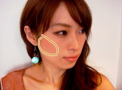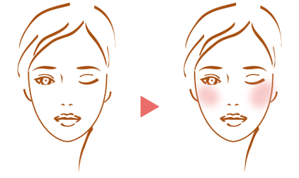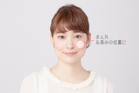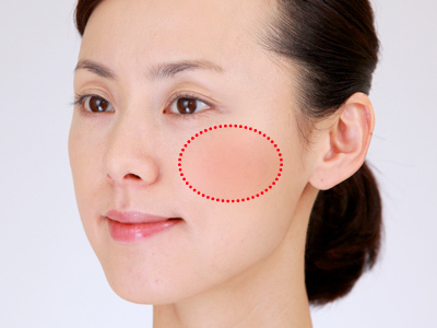 在顴骨最高的位置(也就是笑肌的上方)畫上斜斜的圓形腮紅