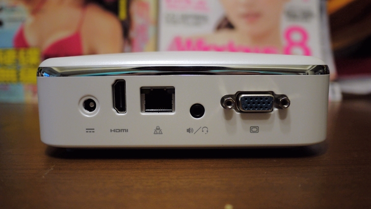 『LIVA X²』主機後側配置有電源插座、HDMI、網路孔座、音效孔座、D-SUB接頭(由左至右)