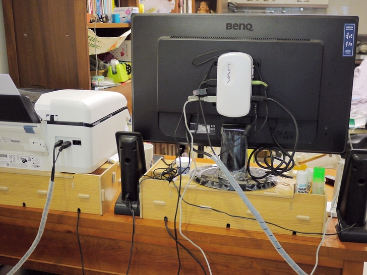 『LIVA X²』裝上線路之後,其實這些線路已經比傳統電腦簡潔了許多呀!而且螢幕如果背向牆壁,根本看不出來這些線路喔!