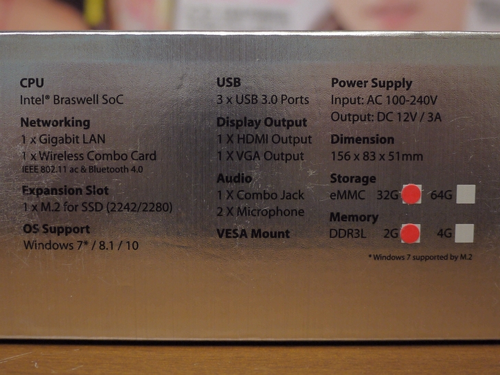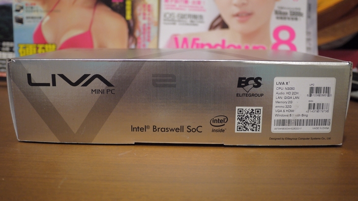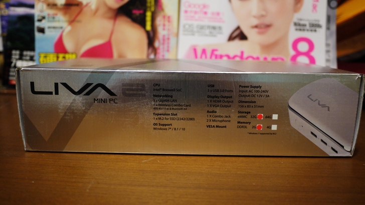 『LIVA X²』外盒側邊標示了規格說明,這次測試的主機記憶體是2G,內建32G eMMC(嵌入式記憶體),eMMC是指將NAND晶片以堆疊方式,直接焊接在行動裝置軟板上,取代過去Micro SD等外接式記憶卡,沒有機械式硬碟無法防震、讀寫次數較少等缺點。