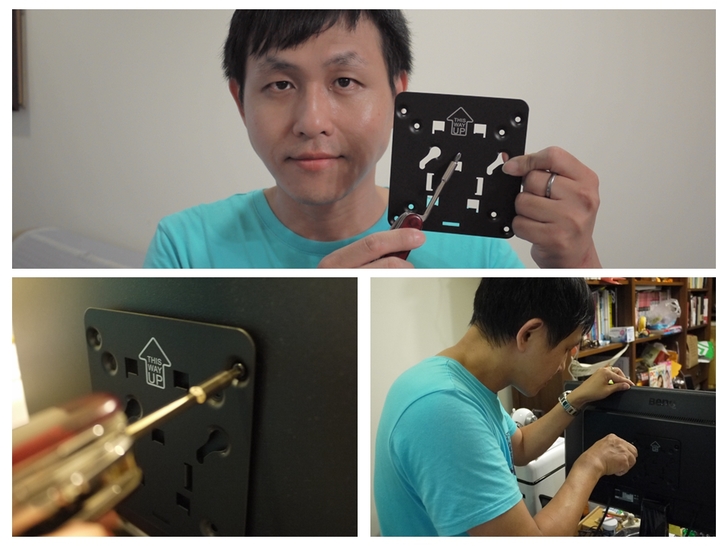 我們先把螢幕背架裝上螢幕吧!其實現在的螢幕都有共通的孔座設計,所以很輕鬆地只要把四個螺絲鎖上螢幕就完成安裝了~~~