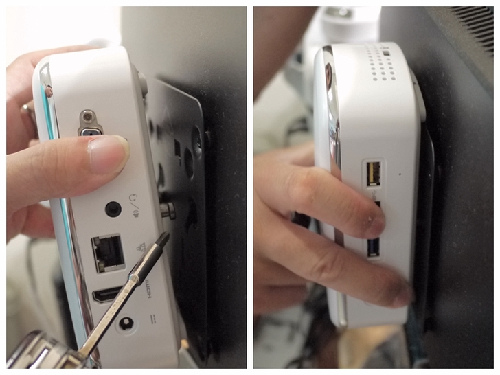 只要把鎖在主機上的螺絲對準螢幕背架的孔座即可安穩的安裝完成~