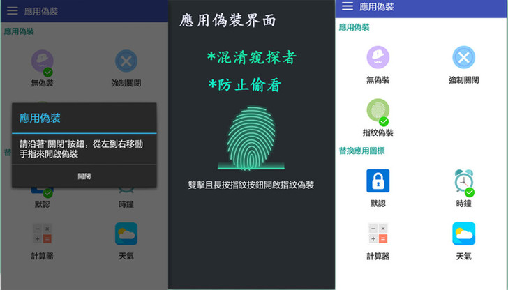 5)既神秘又聰明的功能→偽裝功能:只要設置強制關閉或者指紋偽裝,在解鎖其他應用時都會先過這兩關的,才能進入應用,這時候我們可以進入「Super Applock 」 設置做調整,讓密碼鎖更加聰明,進入[ Settings ]頁面的應用偽裝,就可以設置啦!