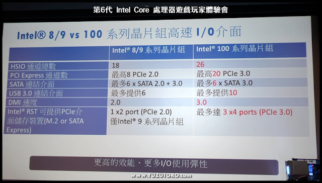 新腳位 LGA1151,功耗 TDP 較上二世代比高得更高、低得更低,最突破的是 I/O 連線速度的改善提高了約莫最高 40% 之多。