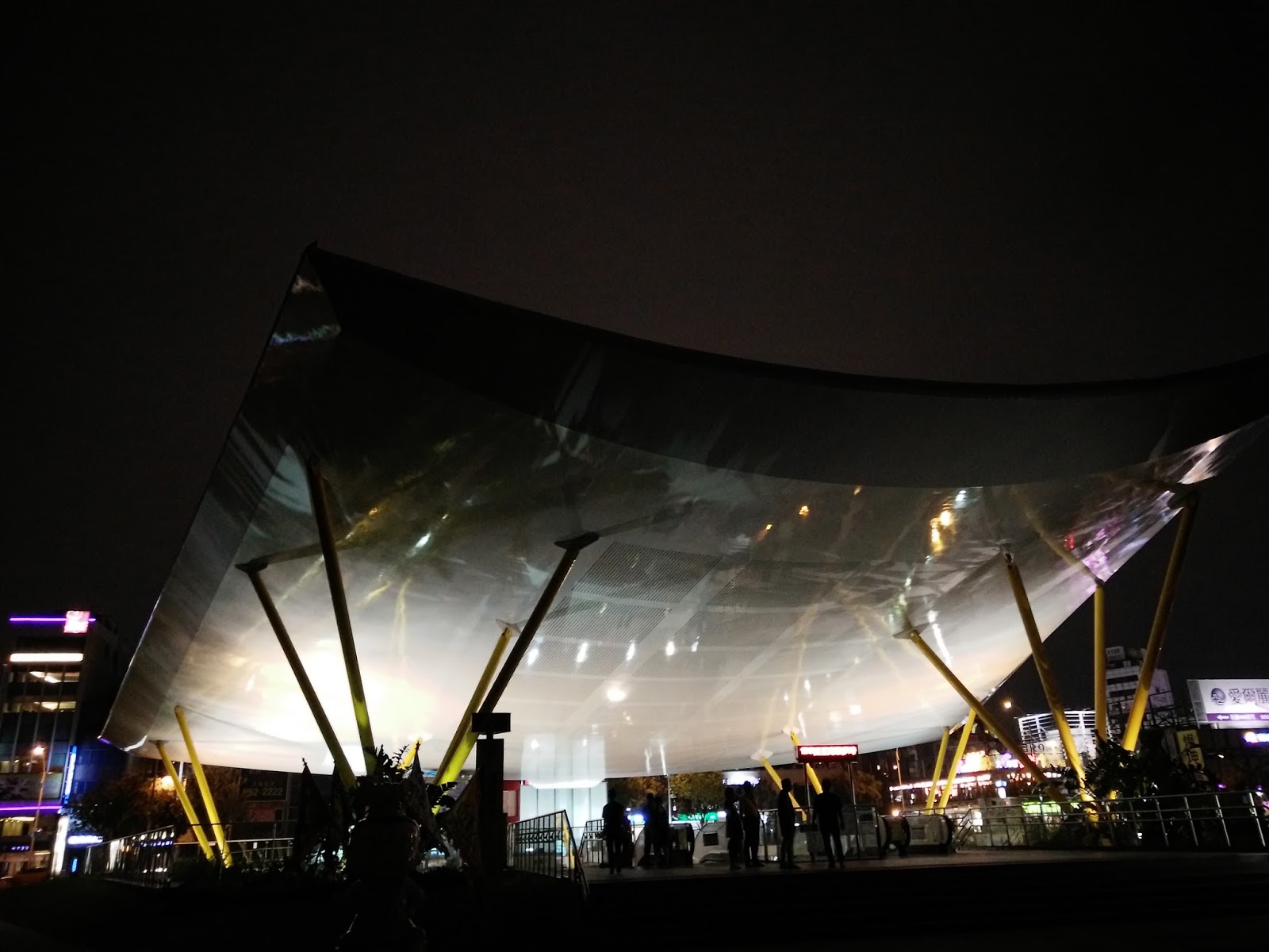 ▲ 出入口除了有點燈之外,前方還有一個小水池,夜間映著燈色,不愧是世界票選第二名的捷運站。(慢速快門)