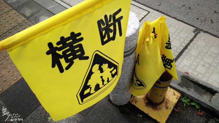 ▲過馬路只要拿起一旁的色小旗子,車輛就會停下來讓人先行