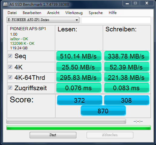 第一套先用老牌子的AS SSD Benchmark測看看,跑出870分的成績