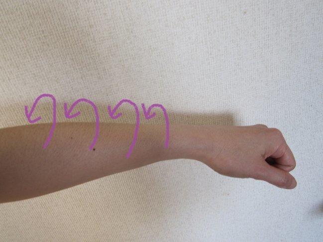 由於肌膚紋理是橫向的,所以依著紋理塗抹