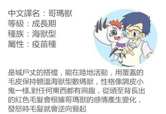 在北極探索基地內的電腦中被發現的海獸型的數碼獸。厚實的毛皮和強壯的身體,擁有就算在極寒之地也毫不在意的構造。戰鬥時候會發出像獅子一樣的叫聲威嚇對手。