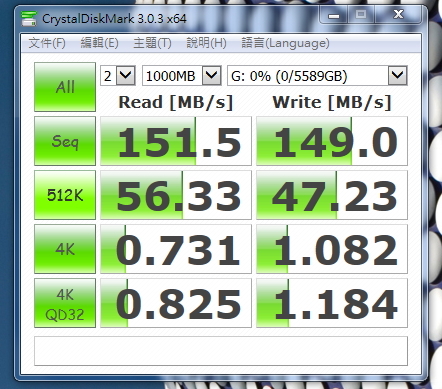 ▲ 先來Crystal DiskMark測試,連續讀寫在150MB左右,較官方的228MB略有差異,應該是平台關係,但表現也是中規中矩。