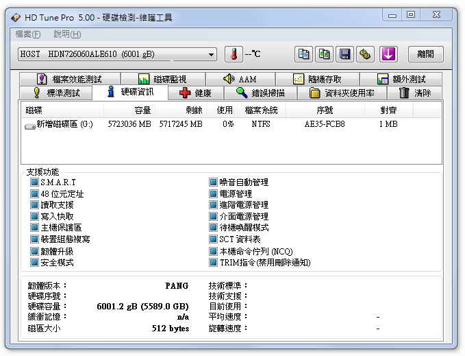 ▲接下來是HD Tune Pro一連串的測試,一開始先來看一下這顆硬碟的規格,所有支援功能的規格都支持了