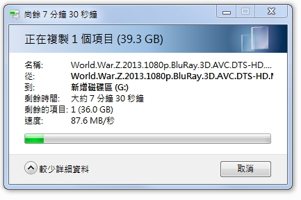 ▲在使用工具測完速度後,實際拿USB 3.0的隨身硬碟來測試,首先拿單一ISO檔,速度可維持在90MB上下,符合一般3.0的速度。