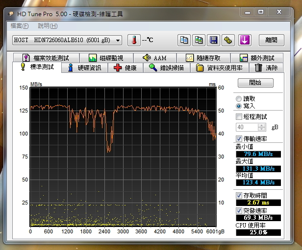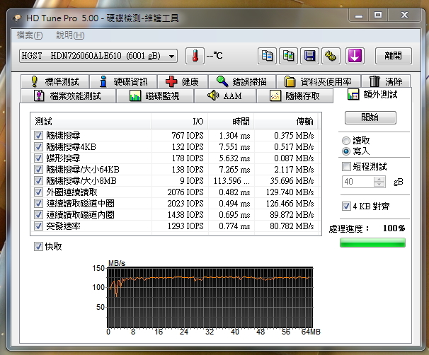 ▲ 再來看寫入測試,速度波動稍大一些,但多維持在125MB左右。