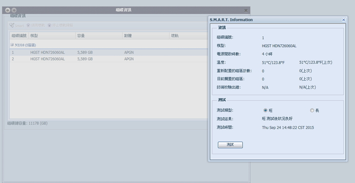 ▲ 可看到二顆HGST 6T NAS碟皆裝上了,温度在運作4小時後,約51度,略高,但仍在範圍內。