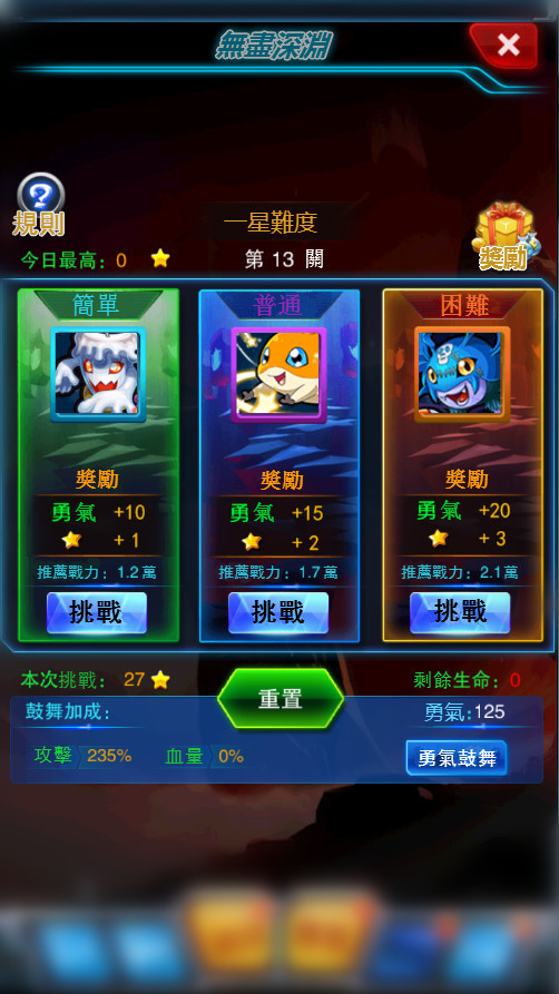 2、 根據戰力不一樣,可挑戰不同星等難度,星等越高,獎勵越多