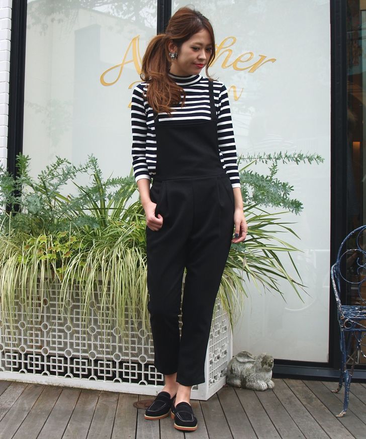 黑色吊帶褲 X 條紋上衣 X 黑色樂福鞋