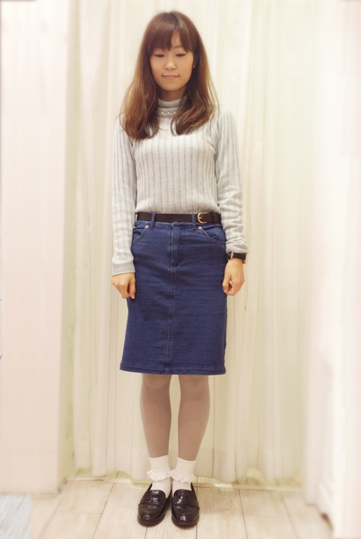 素灰色針織衫和牛仔裙給人很舒服的印象!