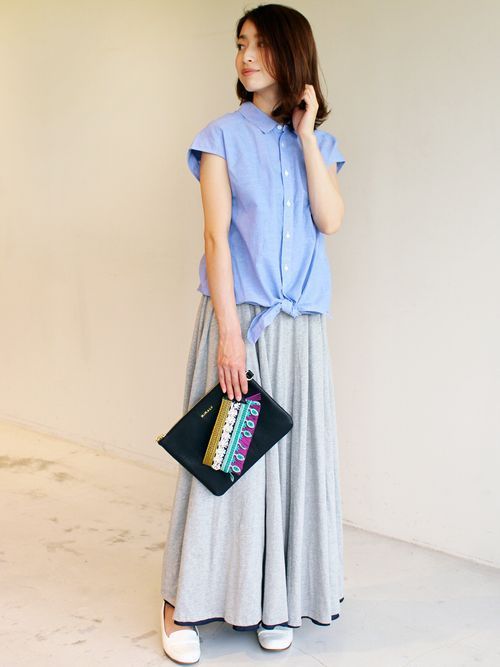牛仔襯衫 X 灰色長裙 X 白色樂福鞋