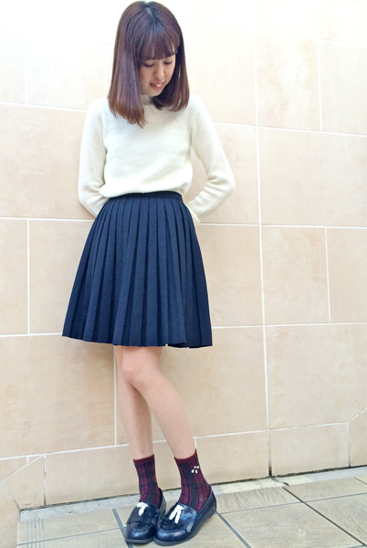 白針織毛衣X海軍藍百褶裙X特色樂福鞋