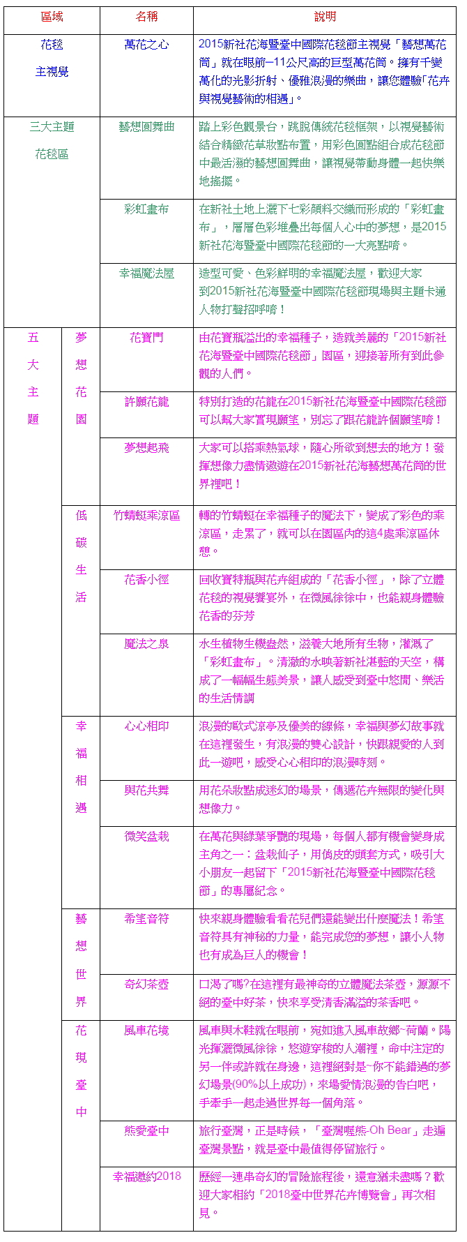 :::2015新社花海暨臺中國際花毯節活動內容:::