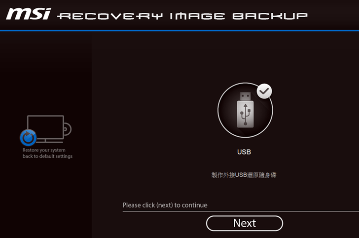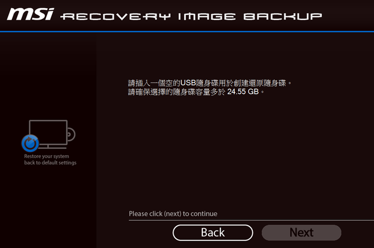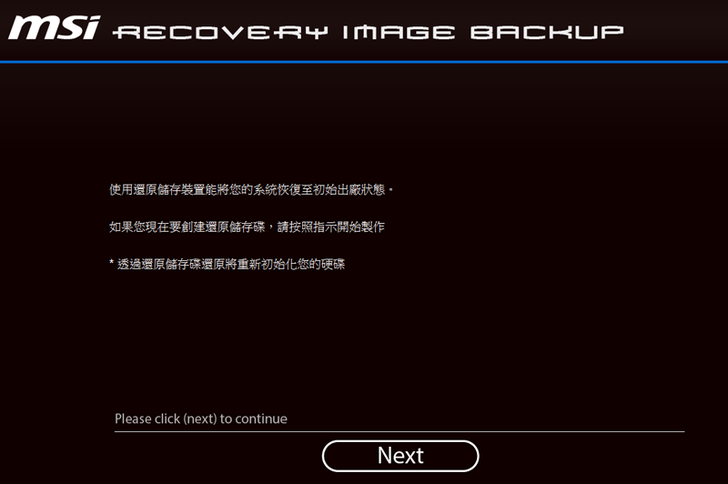▲介紹完MSI的 『Gaming Center』後,NIGHTBLADE MI 還提供了簡單易用的「Recovery image Backup」程式,能快速將系統回復至原廠設定。