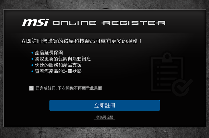 ▲初始MSI NIGHTBLADE MI會提醒線上註冊,可以享有更多的福利