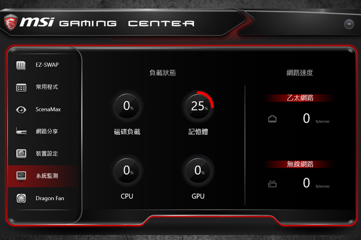 ▲另外在Gaming Center中也提供「系統監測」功能,能對磁碟、GPU和CPU負載、記憶體使用等狀況以圖形化顯示