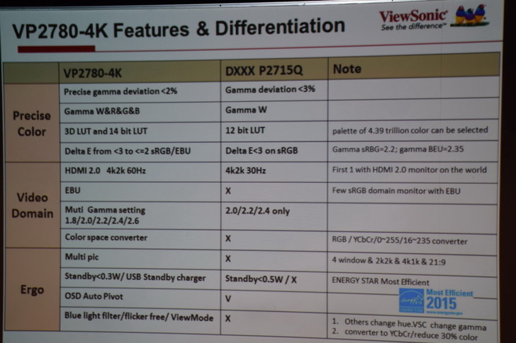 ▼ ViewSonic VP2780-4K 與目前世面上的同級產品進行比較,PM 強調
