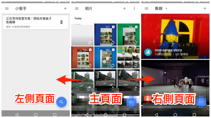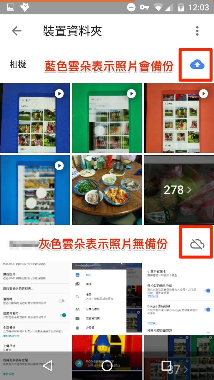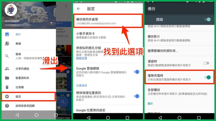 而後,滑出側邊欄中「設定」的「備份與同步處理」在備份設定中找到「僅限充電時」才備份,如此一來,平日使用不會消耗電量,睡覺時就讓他自動上傳你的相片,亦毫無負擔。