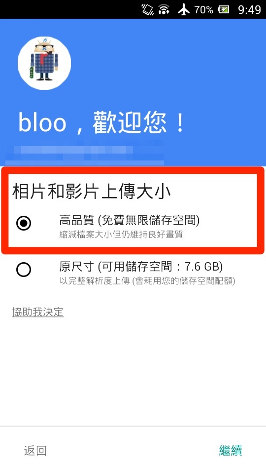 接著詢問「要使用壓縮的照片檔,或是原尺寸的照片進行備份」,這部分就要看個人的偏好,因為壓縮過的照片檔檔案比較小,但是和原始照片的仍會有些色差,若選擇原尺寸的話則有容量空間限制(最多 15 GB 的空間能進行備份),可以自行做決定。