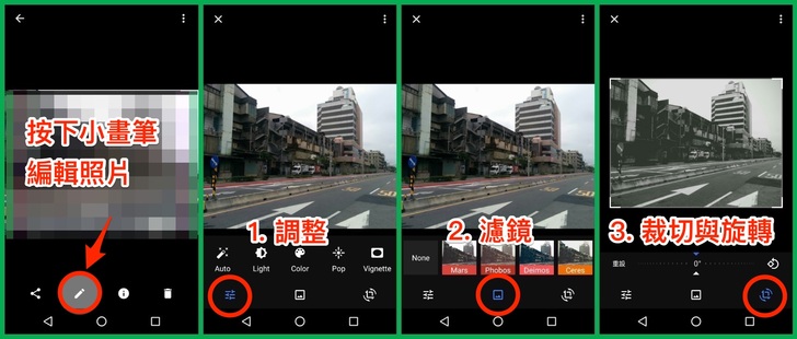2. 照片編輯:即便照片是自己拍的,但也不是每張照片都符合自己的意,點選想要編輯的照片,按下小畫筆即可開始編輯照片。下方,有三個選項:調整、濾鏡、裁切與旋轉。