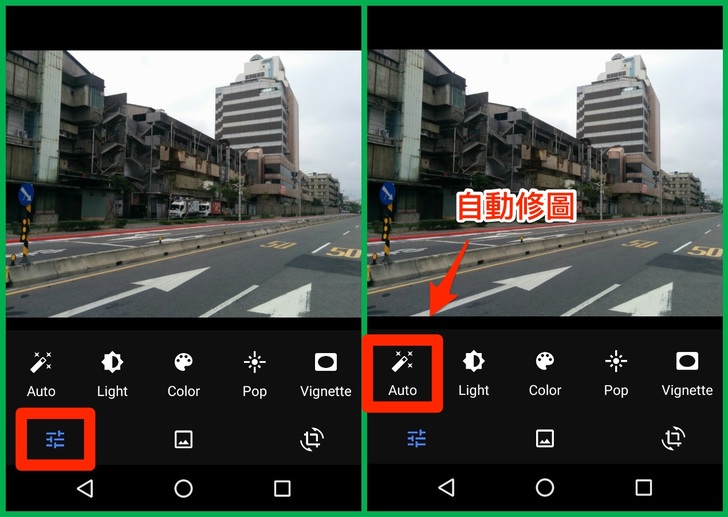 調整可以調整照片亮度、色彩、流行或是加上暈影。如果不知道怎麼調整照片會讓照片變得更美按下「自動」就立刻為你修飾好照片。