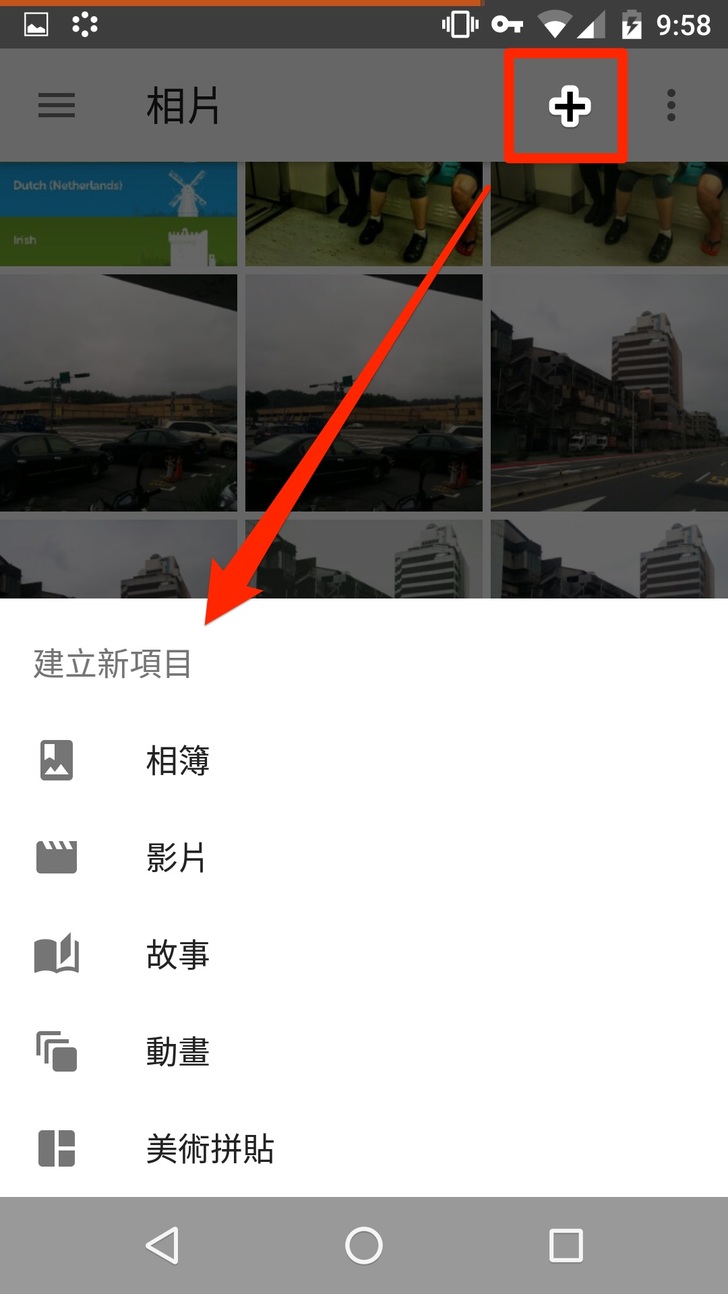 3. 照片整理:將照片編輯好之後,該整理照片,在主頁面中選擇想要整理的照片,按下右上角的「+」符號,即可建立相簿、影片、故事、動畫、美術拼貼。
