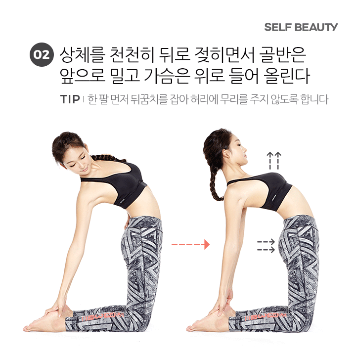 2. 上半身慢慢往下,胸部跟著往上方挺。