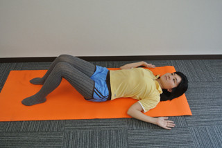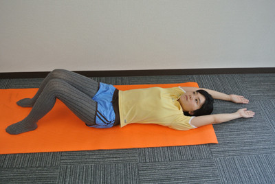 如圖示的姿勢屈膝躺好,雙手往上伸展,