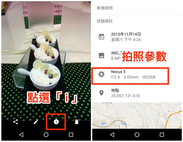 1. 小 i 的秘密:對於喜歡攝影的朋友,攝影時參數設定相當重要,可用作未來拍照的參考。手機拍照是否也有這些參數的設定紀錄?點選照片後,照片下方的「 i 」,其中即可看到關於照片的相關資訊,像是拍攝的時間、地點、和拍照參數。