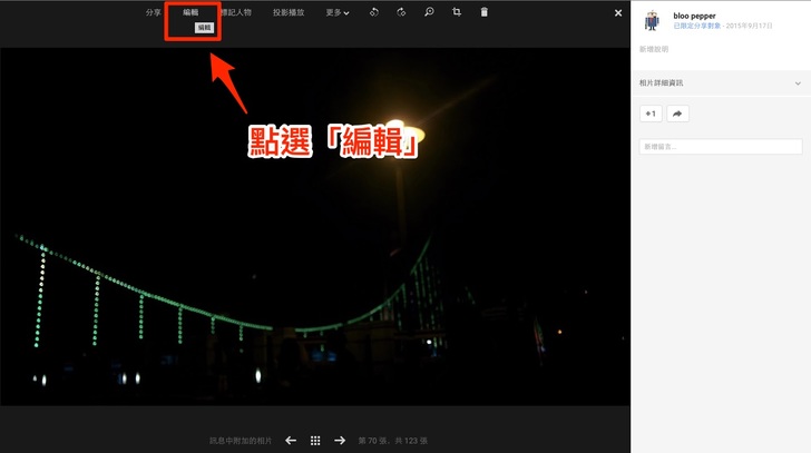 ====>將照片先分享到 Google + 上(一定要分享),於網頁版的 Google + 點選「編輯照片」即可在其中做更多更細緻的調整! *(這功能最詭異....一定要分享才能編輯,難道是 Google 忘了要移除的功能)